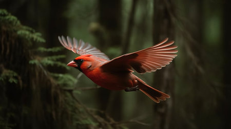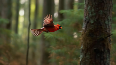 Red Cardinal in Flight with Vibrant Wings against Serene Forest Backdrop