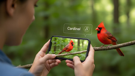Person uses smartphone augmented reality app to identify a red cardinal bird on a branch