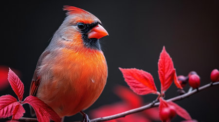 Male Northern Cardinal (cardinalis cardinalis) perched on a branch with red leaves
