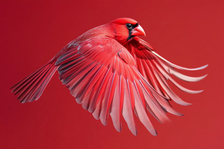 Red cardinal bird isolated on red background. Red cardinal bird in flight.