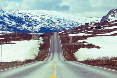 Road trip to Norway, driving on highway along beautiful high snowy mountains, traveling to Europe, freedom and adventure concept..