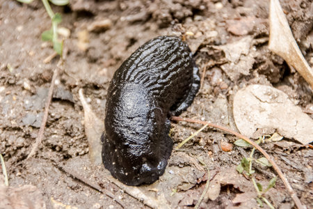 Large black slug living in a garden plot, pests of garden crops, close-up