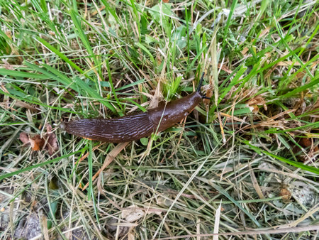 Close-up of the Spanish slug Arion lusitanicus. Large, slimy brown slugs crawl around the garden. The slug infestation damages leaves and crops.