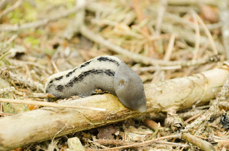 Close up view of brown slug (Arion vulgaris) on wooden log