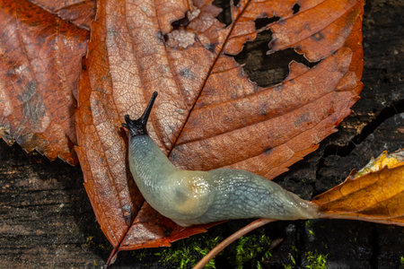 Macro photo of a slug in forest. Shell-less terrestrial gastropod mollusc on bright autumn leaf.