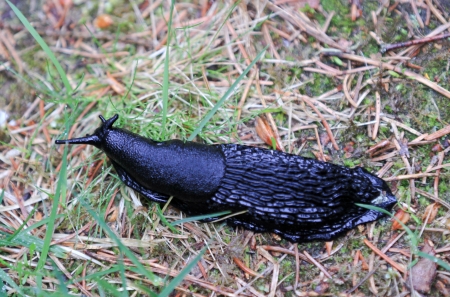 macro photograph of a huge slug, Arion ater, black in color and an interesting texture