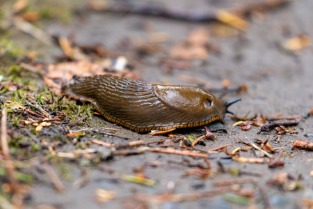 A closeup of Slug. The Spanish Slug (Arion vulgaris), sometimes called the killer slug, on a sandy road.