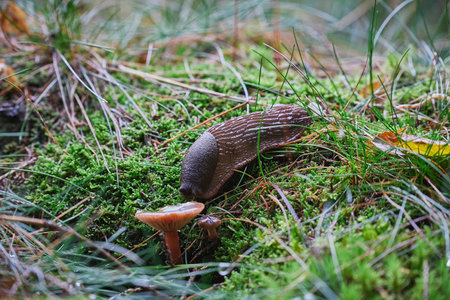 Black slug in the forest. Shallow depth of field. Selective focus.