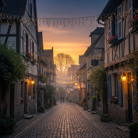 A charming cobblestone street in a quaint town at sunset with string lights and flowers