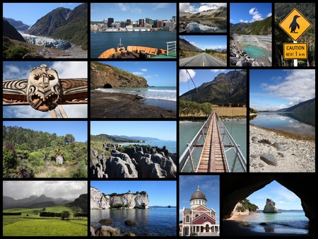Photo collage from New Zealand. Collage includes major landscapes with mountain, glaciers, ocean and beaches.