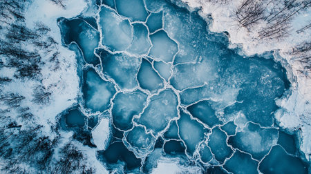 Aerial view of frozen lake. Cracked Ice from drone view. Background texture concept