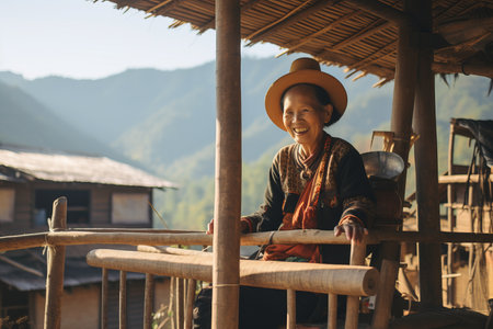 Portrait of happy elderly Asian woman in traditional rural setting, serene and timeless beauty