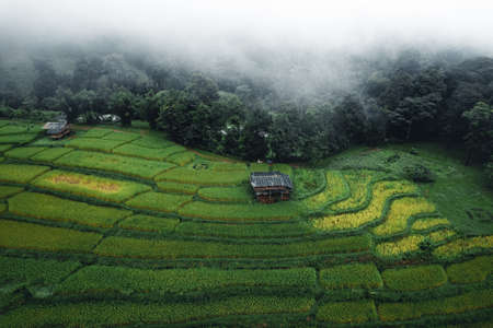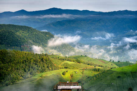 Natural landscape View of rice fields, forest in sunset, mist flowing clouds of rice fields, Pa Bong Biang, Mae Chaem District, Chiang Mai Province, Thailand.