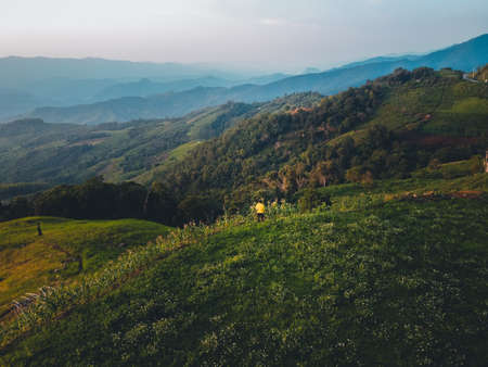 Panoramic view of beautiful mountain landscape in the north of Thailand with green mountain pastures.