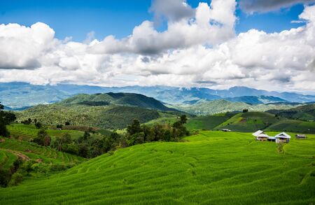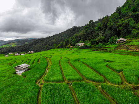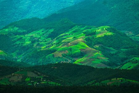 Sunset scene on the top of the mountain. View of rice plantation over the hills. Pa Bong Beang rice field village, Chiang mai, Thailand.