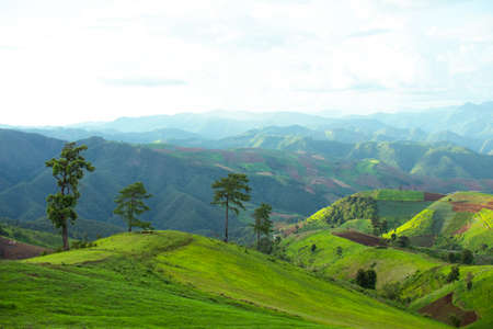 The scenic view of Thai highlands in the sunlight and bright sky.