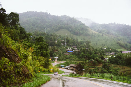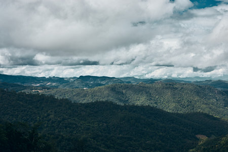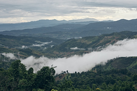 Scenic view of misty mountain in rain season at Doi Pha Hee, Chiang Rai, Thailand.