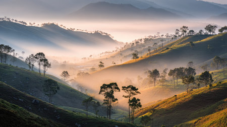 This captivating image showcases a tranquil landscape with lush green hills and a misty background, perfectly illuminated by soft morning light for nature lovers.