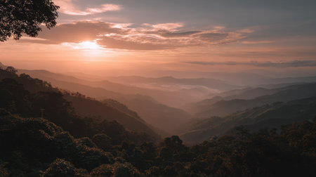 A breathtaking view of layered mountains at sunset, shrouded in mist and illuminated by golden light. Perfect for nature lovers and travel enthusiasts.