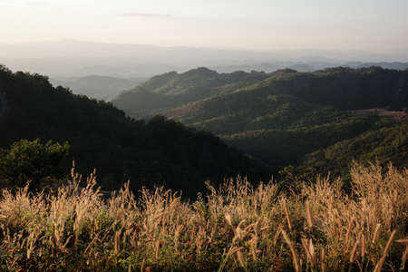 Tranquil landscape on trekking route on top of hazzy tropical rainforest mountain hill with foreground of orange flowering grass at sunset of winter season in Thailand.