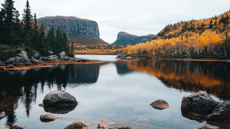 A tranquil lake reflects towering cliffs and vibrant autumn foliage. Rocks dot the foreground, adding depth to the serene landscape under an overcast sky.