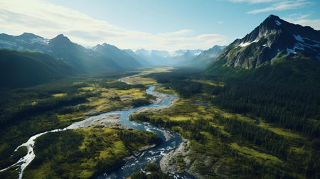 Majestic river flows through tranquil valley surrounded by towering mountains. Generative AI