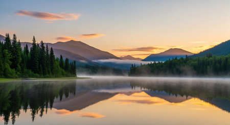 Peaceful mountain lake reflecting morning light with forest backdrop