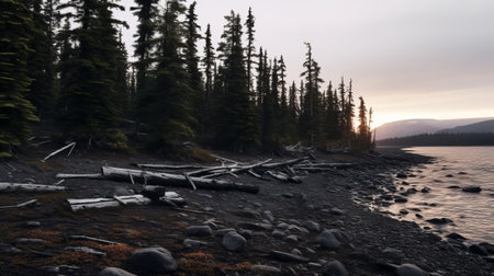 sunrise over a rocky shoreline near a majestic mountain, captured in the style of native american, first nations, and alaska native art. this stunning image, taken with a ricoh gr iii, showcases atmospheric woodland imagery with dusty piles and a palette of dark black and gray. it evokes a sense of urban exploration and site-specific installations. ai generated