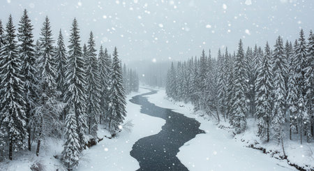 A snowy winter scene with pine trees covered in snow, a frozen river, and soft snowflakes falling gently from the sky, creating a serene atmosphere.