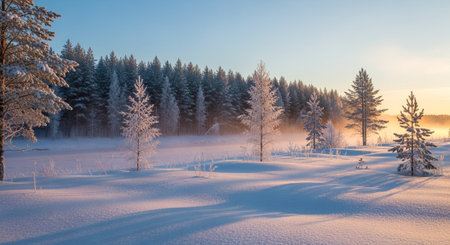 A winter forest scene at twilight with snow covered trees and a gradient sky. Clear details and vibrant colors enhanc...
