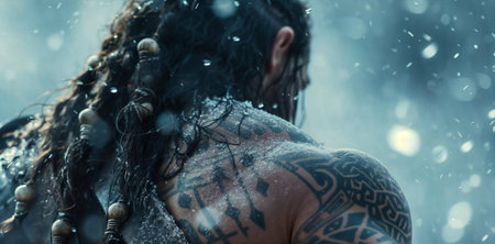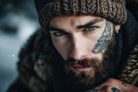 A striking image of a man with Icelandic heritage, displaying his intricate tattoos while braving the frigid winter climate. Ai generated