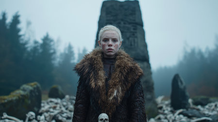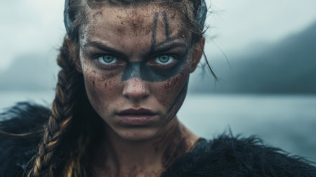 Close-up of a fierce Viking woman with braided hair and black war paint, standing in a misty, battle-ready environment with an intense gaze.