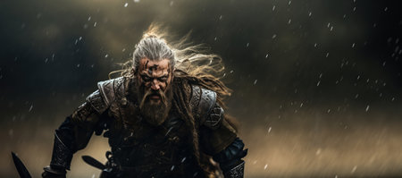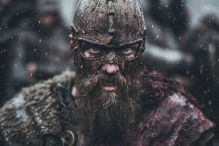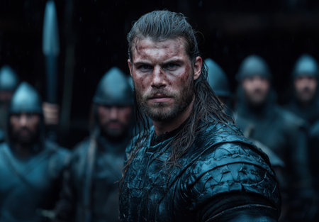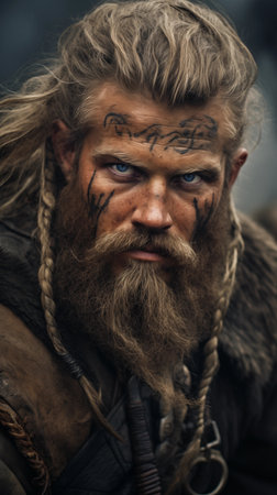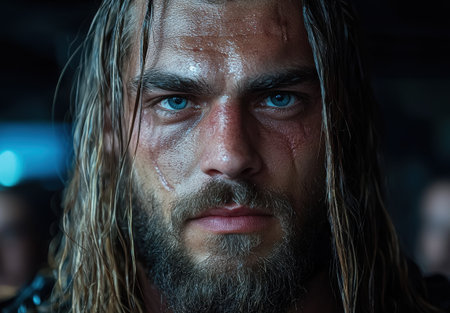 Rugged warrior with battle scars and intense gaze