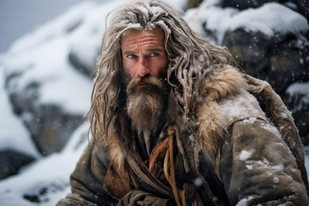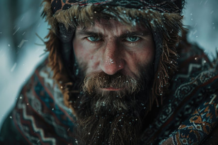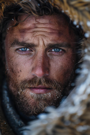 Rugged warrior with piercing blue eyes in a wilderness setting