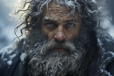 Elderly man with a beard gazes into the distance during a snowstorm in a cold outdoor setting