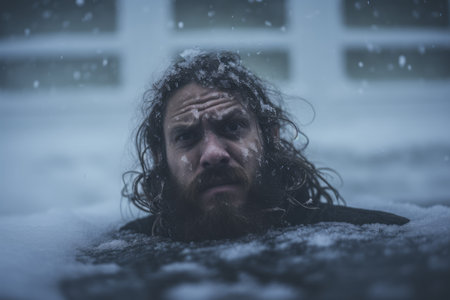 Man with beard immersing in icy water on winter day. Frigid aqua hole male. Generate Ai
