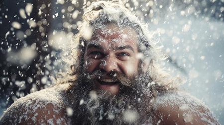 Frosty Man immersing in icy water on winter day. Cold river ice snow. Generate Ai