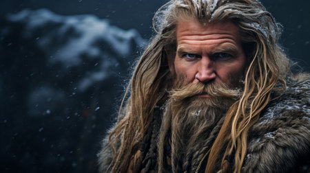 A fierce warrior with flowing hair and a striking beard stands in a snowy forest during a winter storm, exuding strength and determination