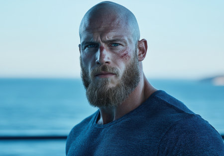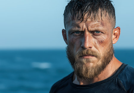 Rugged man with beard and intense gaze against blue ocean backdrop