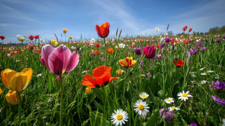 Beautiful spring flowers in the meadow at sunset. Nature background