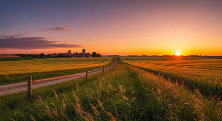 Road showing golden sunset over a rural farm landscape with wheat fields and a dirt road leading to buildings. resolution