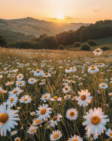 A field of daisies blooms in the foreground, with rolling hills and a sunset in the background.