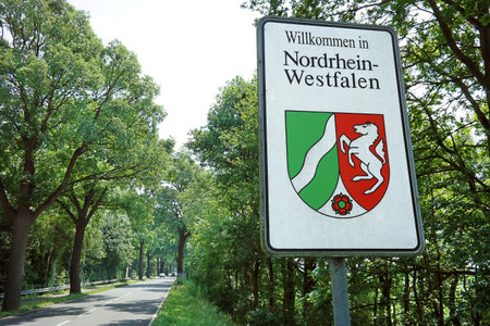 Welcome sign with the official coat of arms of the German state of North Rhine-Westphalia.
