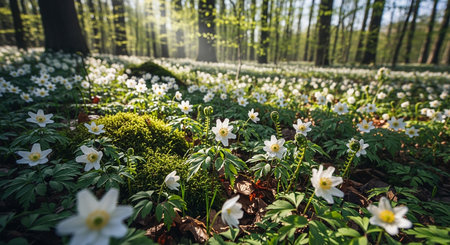A single white flower with a yellow center is featured, its petals illuminated by soft sunlight. The composition highlights the flower's delicate texture and form against a blurred backdrop. The image suggests a natural setting with potential applications for springtime themes or editorial content.