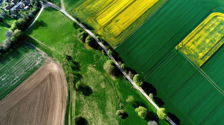 Discover an aerial landscape showcasing vibrant green and yellow fields, winding paths, and lush trees under a clear sky, highlighting rural beauty.