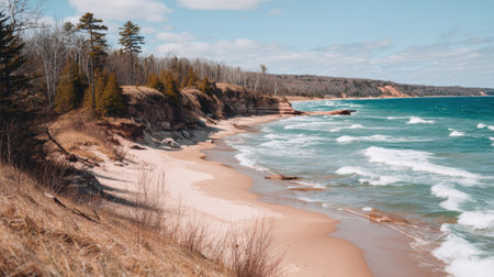 a trail winds its way along the picturesque coast, surrounded by tall trees and soft sand. the photo captures the moody colors of the scene, showcasing the beauty of nature. shot with an olympus xa camera, it highlights the stunning coastal and harbor views. the image reflects the artistic style of the northwest school, with detailed marine views and a touch of forestpunk aesthetic. the