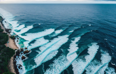 A stunning aerial shot of the ocean waves and sandy beach, with a soft illumination and a picturesque scenery
