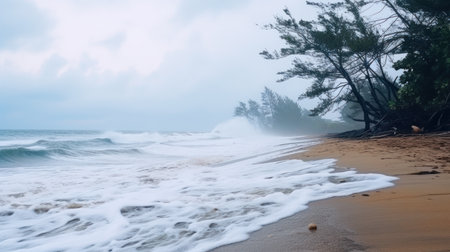 the coastal landscape, shrouded in mist, features a mix of deciduous trees and firs, their tops visible above the fog, on a rainy day, evoking a sense of serenity and tranquility, perfect for nature lovers and photographers capturing the beauty of the ocean's edge on a gloomy day. ai generated
