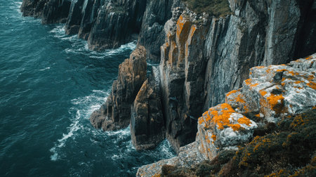 Explore the stunning view of rugged cliffs adorned with vibrant orange lichen, overlooking turquoise waves crashing against the shoreline. Enjoy the natural beauty.
