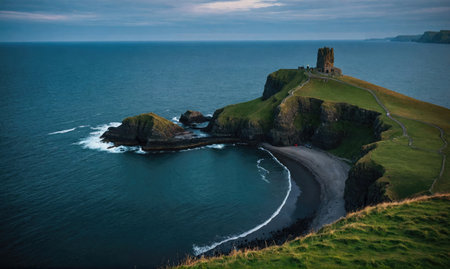 A stone castle sits on a cliff overlooking a crescent-shaped bay in Northern Ireland